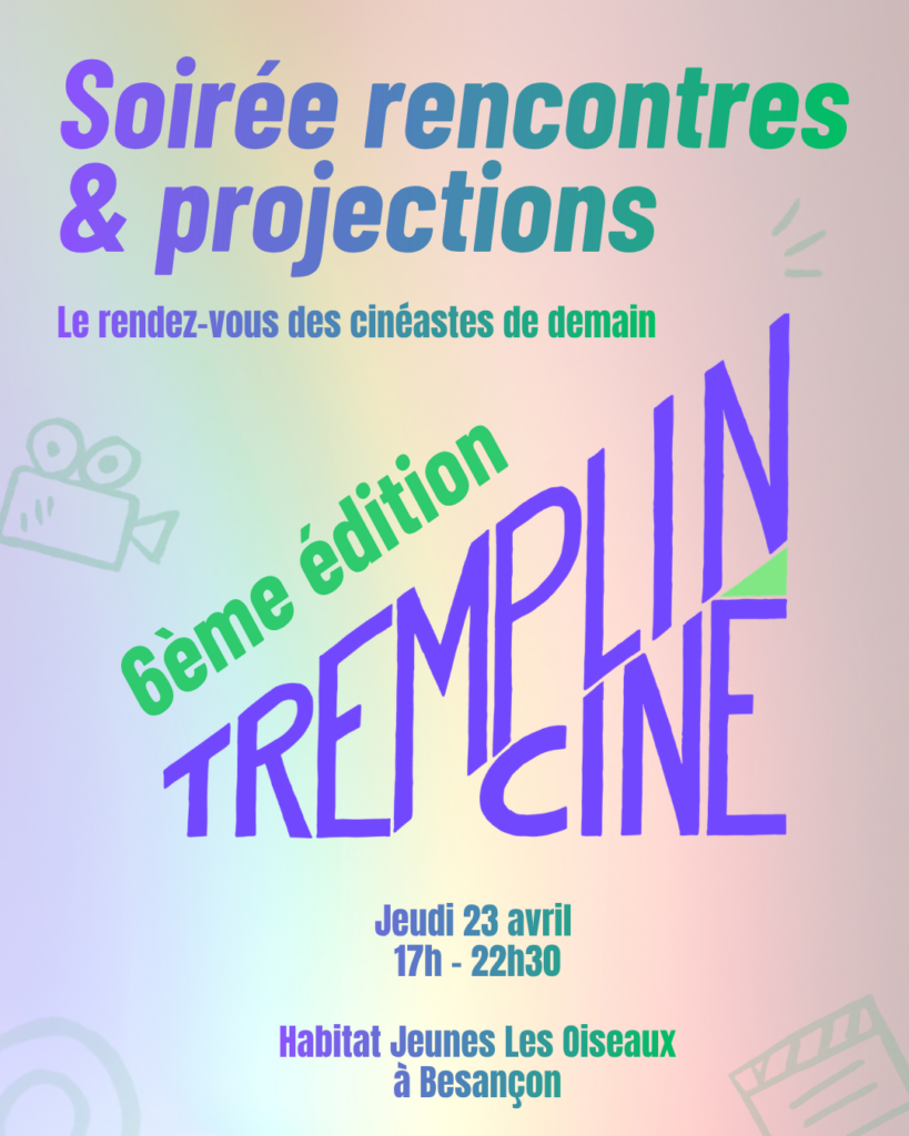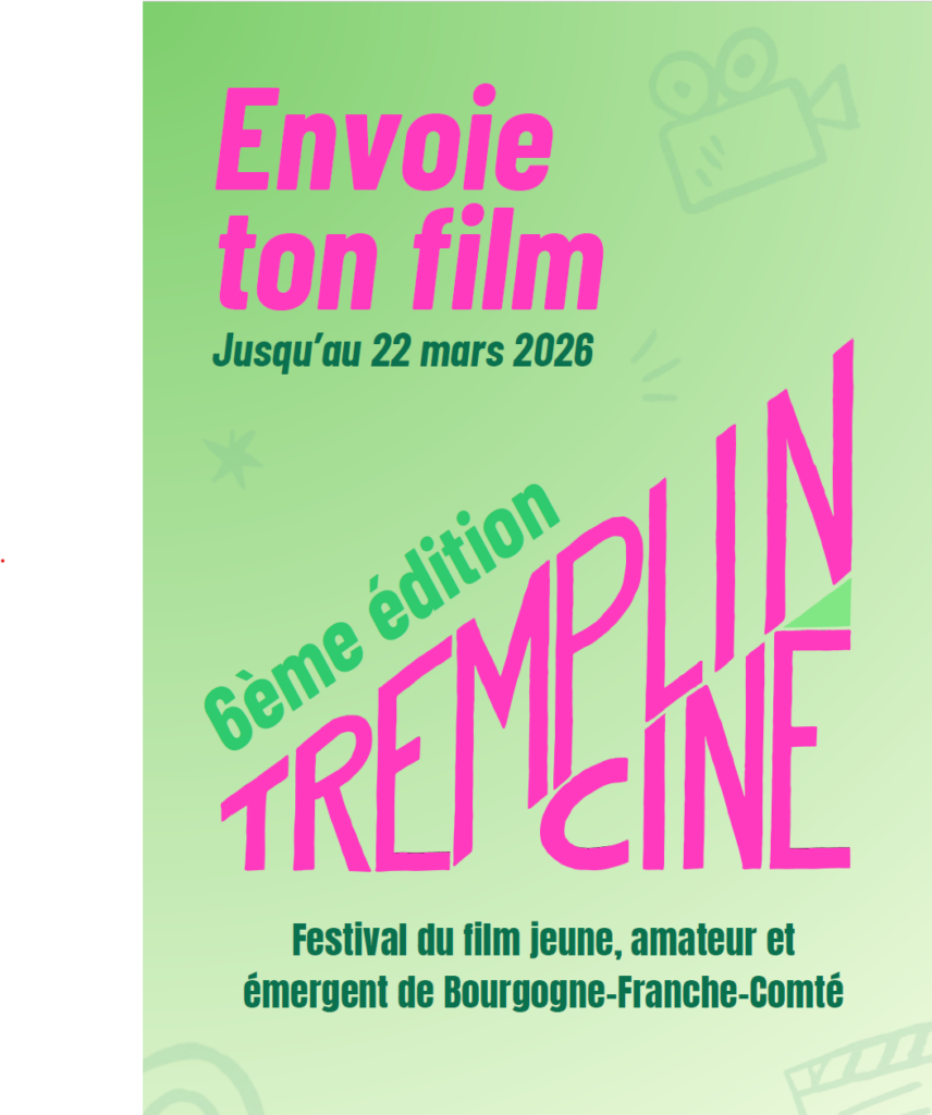 TREMPLIN 2022 – un prix de 500€ pour soutenir la jeune création ! Tremplin c’est un festival de cinéma amateur dédié à la jeune création, aux autodidactes et aux passionnés·es. Tu peux participer si tu as entre 14 et 30 ans et si tu résides en Bourgogne Franche-Comté. Les lauréats·es pourront gagner un prix de 500€ pour leurs prochaines créations. Les inscriptions sont ouvertes à tous les films : fictionnels, expérimentaux, documentaires, animées de moins de 20 minutes. Les œuvres retenues seront diffusées sur grand écran lors d’un événement public.Inscriptions jusqu’au 30 avril 2022 en suivant ce lien