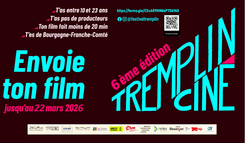 TREMPLIN 2022 – un prix de 500€ pour soutenir la jeune création ! Tremplin c’est un festival de cinéma amateur dédié à la jeune création, aux autodidactes et aux passionnés·es. Tu peux participer si tu as entre 14 et 30 ans et si tu résides en Bourgogne Franche-Comté. Les lauréats·es pourront gagner un prix de 500€ pour leurs prochaines créations. Les inscriptions sont ouvertes à tous les films : fictionnels, expérimentaux, documentaires, animées de moins de 20 minutes. Les œuvres retenues seront diffusées sur grand écran lors d’un événement public.Inscriptions jusqu’au 30 avril 2022 en suivant ce lien